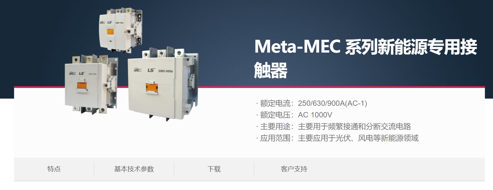 當(dāng)前位置網(wǎng)站首頁 > 產(chǎn)品展示 > LS產(chǎn)電電氣元器件 > 接觸器(MC)&熱過載繼電器(MS) > Meta-MEC 系列新能源專用接觸器 >