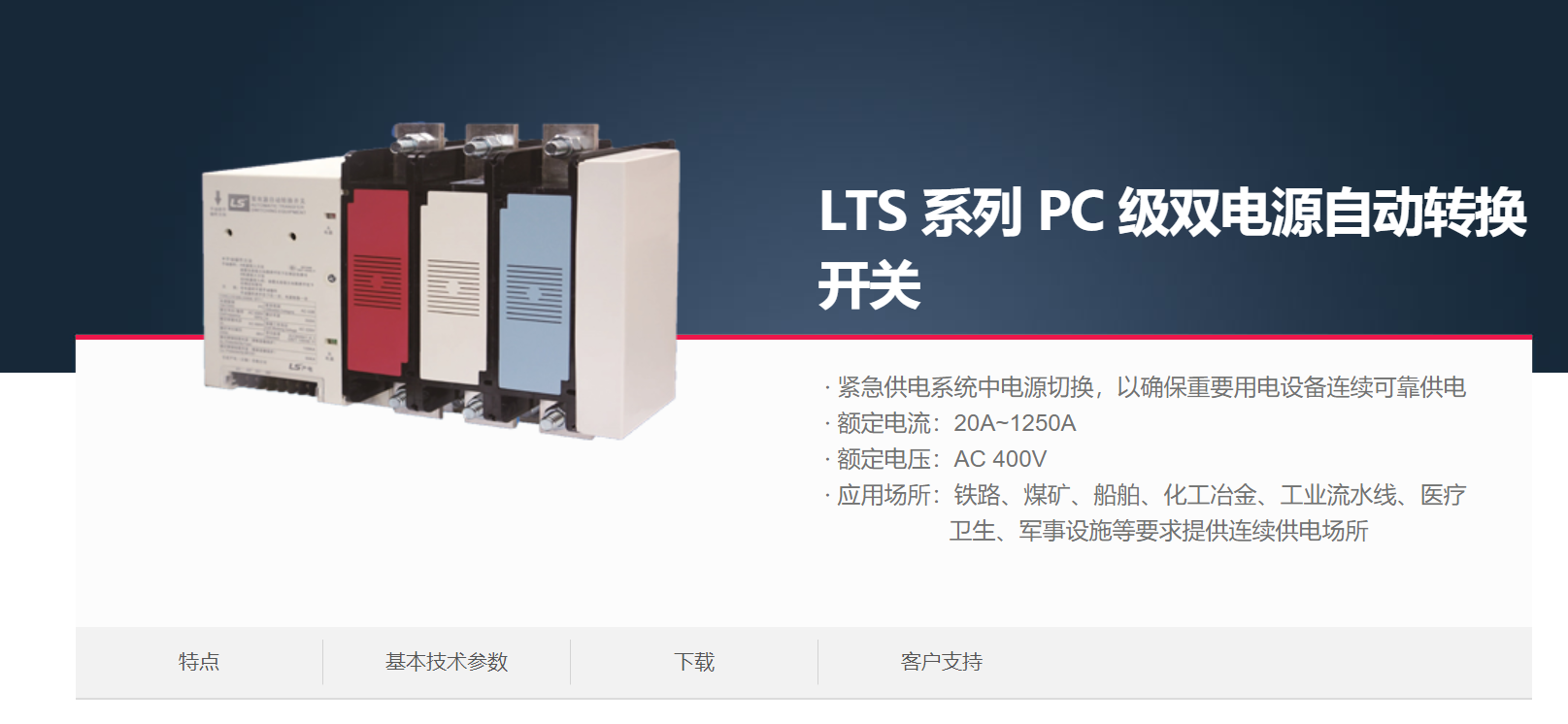當(dāng)前位置網(wǎng)站首頁 > 產(chǎn)品展示 > LS產(chǎn)電電氣元器件 > 微型斷路器&雙電源開關(guān) > LTS 系列 PC 級雙電源自動轉(zhuǎn)換開關(guān) >